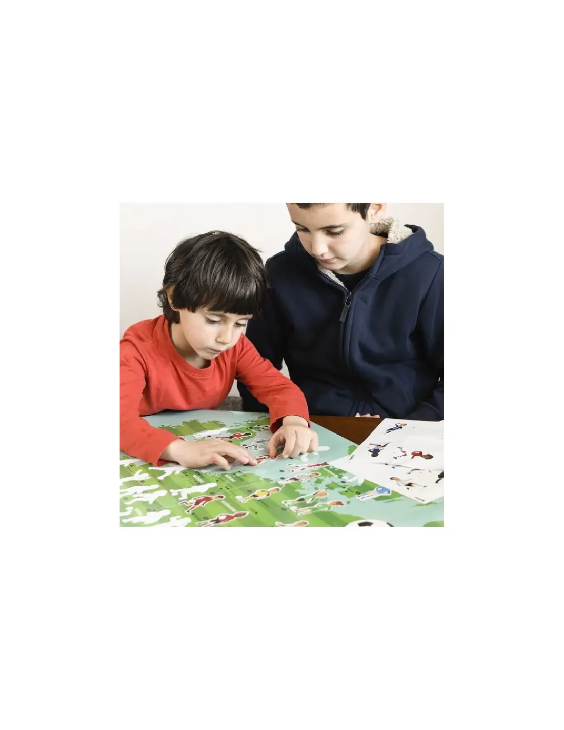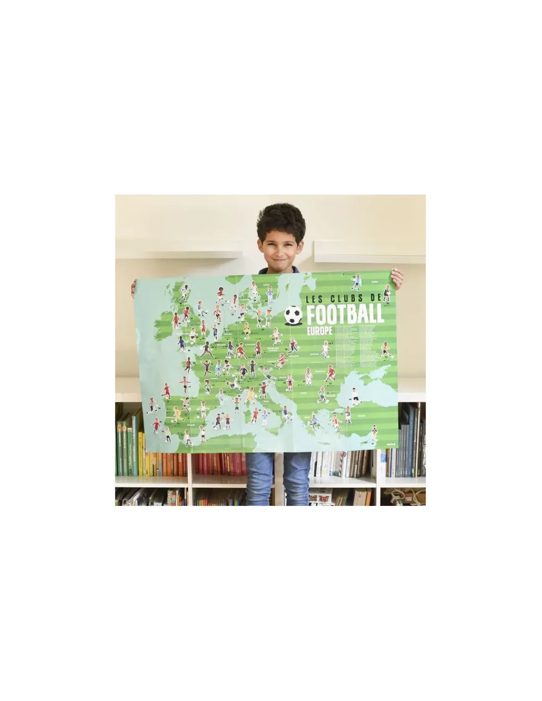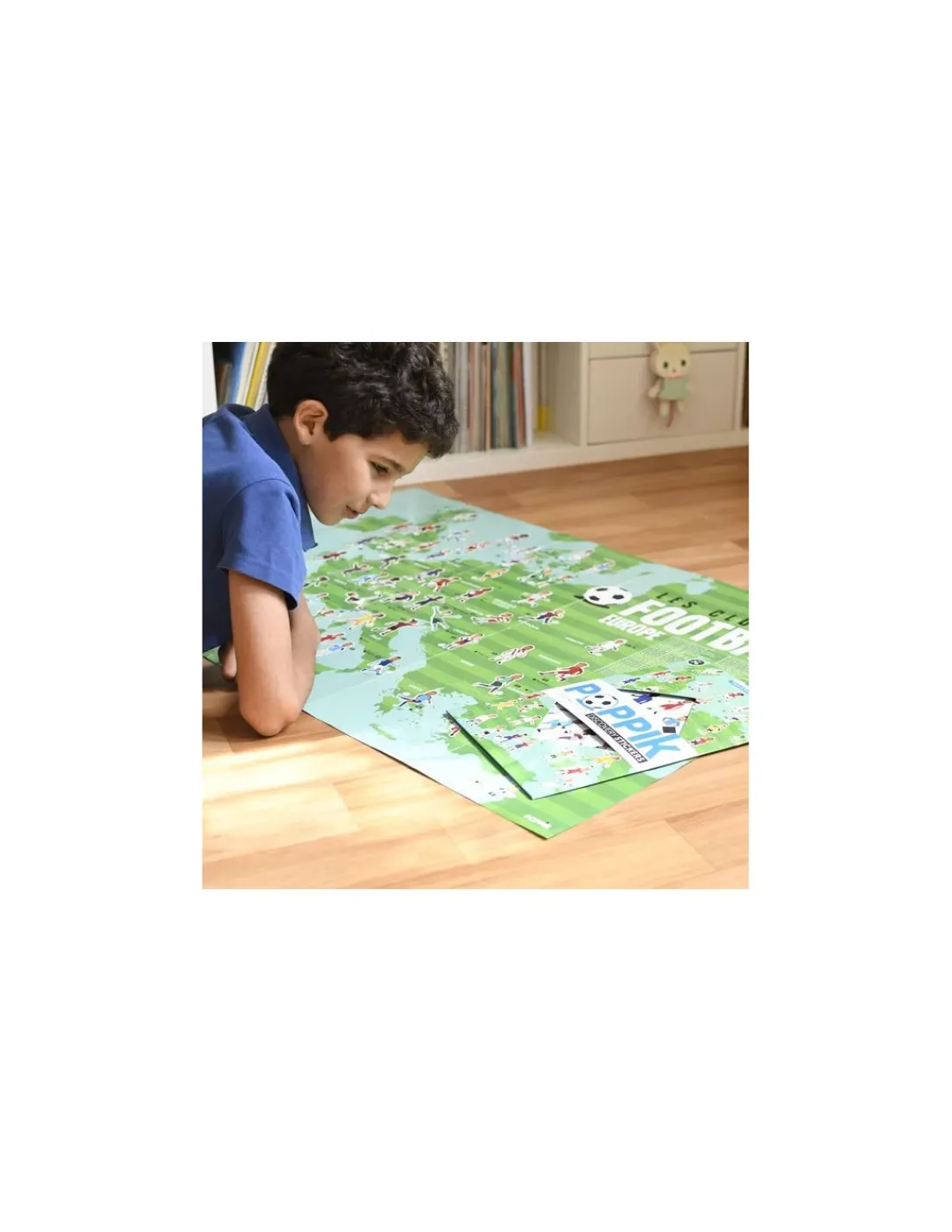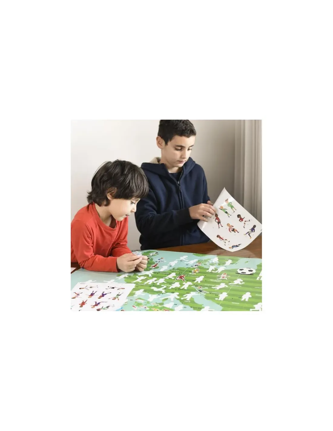 Cette affiche présente une grande carte d’Europe, avec les 60 clubs les plus célèbres. Chaque club est représenté par un joueur, habillé aux couleurs de son équipe. L’enfant doit coller chaque joueur au bon endroit. Ce jeu permet de mieux se situer en Europe, et de connaître sur le bout des doigts les différentes équipes de foot. Les passionnés vont se régaler. Pour coller les autocollants, l’enfant observe les numéros et les silhouettes des dessins.