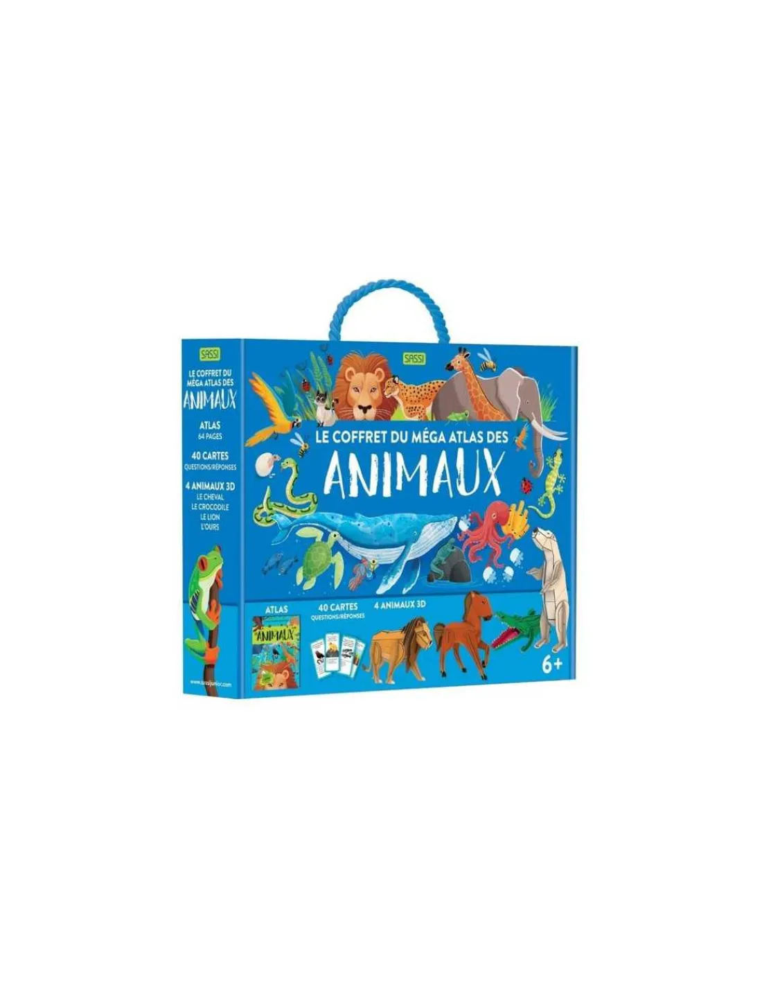 Découvrez le coffret du méga atlas des animaux de Sassi, un cadeau éducatif destiné aux enfants à partir de 6 ans, comprenant une encyclopédie de 64 pages, 4 maquettes d’animaux (crocodile, ours, lion et cheval) et 40 cartes « Questions – Réponses » pour découvrir les secrets des animaux.