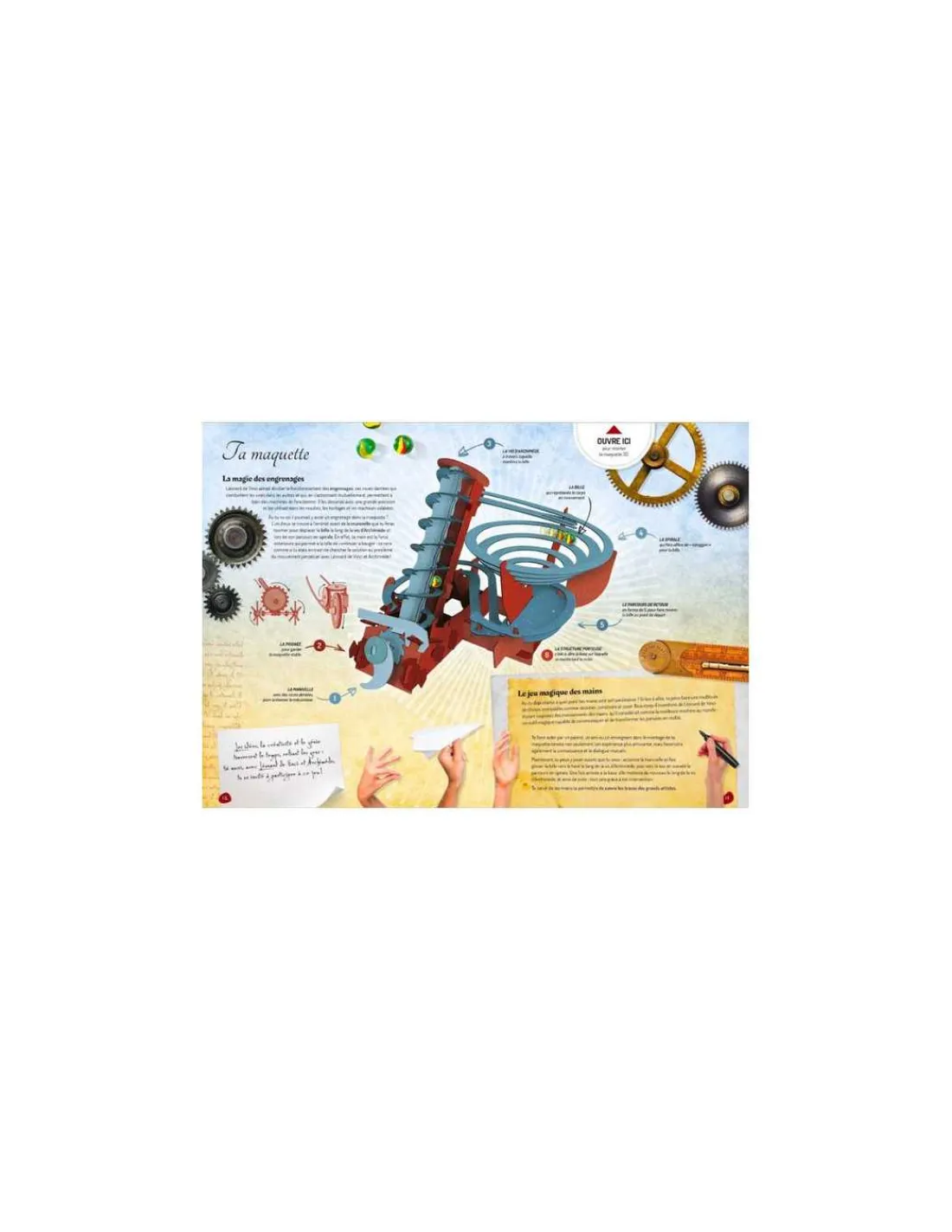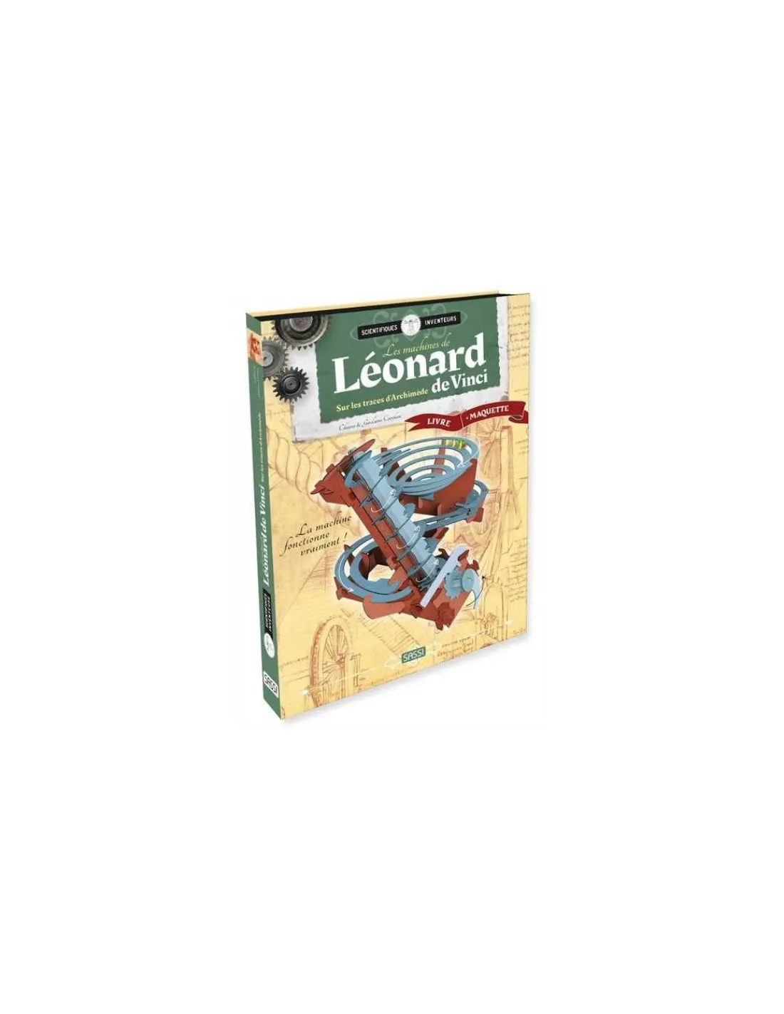 Découvrez les machines de Léonard de Vinci Sur les traces d’Archimède de Sassi, un coffret comprenant un livre de 14 pages pour découvrir l’histoire des machines de Léonard de Vinci et une maquette 3D à construire.