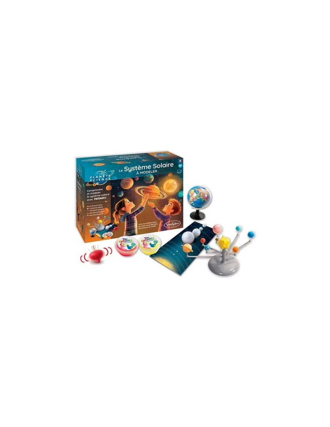 Grâce à la Patarev, une pâte à modeler créative, il sera possible de faire une mise à l’échelle des planètes, tout en découvrant leurs particularités, avant de construire un mini Système Solaire et d’observer le principe des éclipses. La notice montre également comment fabriquer une toupie qui, une fois lancée, aidera à comprendre et illustrer les mouvements de la terre, à l’origine des jours et des saisons.