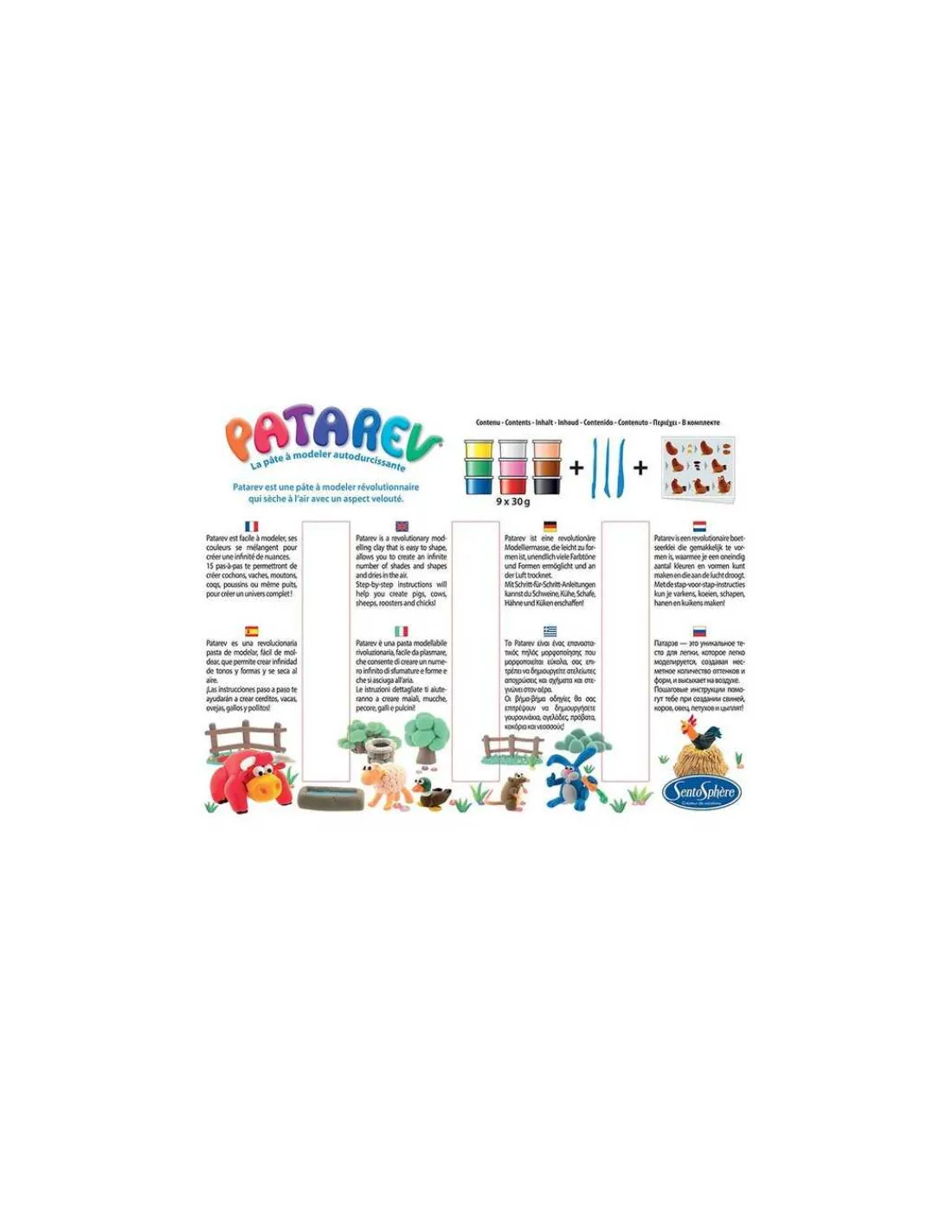 Le coffret comprend 9 pots de Patarev de 30 g chacun (couleurs : jaune, rose fluo, blanc, noir, rouge, chair, marron, bleu et vert), 3 outils de modelage et une notice pas-à-pas avec 12 réalisations.