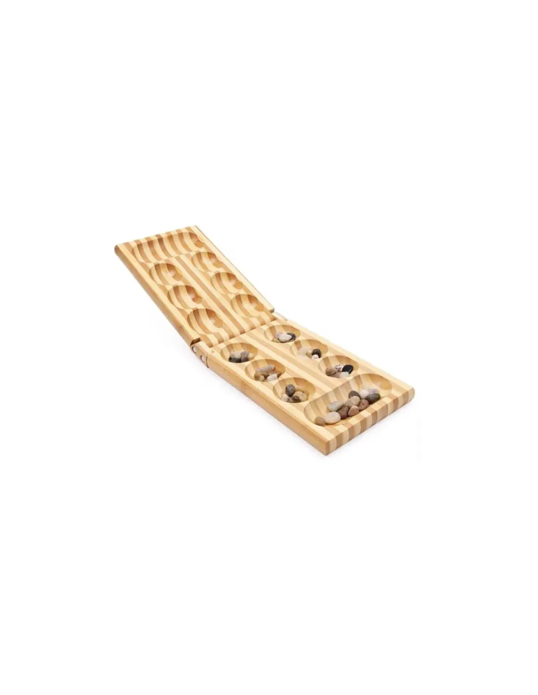Cette boite de haute qualité en bambou avec des cavités intérieures contient l’ancien mais intemporel jeu de stratégie et de logique « Kalaha ». Deux joueurs se battent pour la victoire en redistribuant les 48 pierres naturelles. Un jeu passionnant dans lequel le gagnant est celui qui a le plus de pierres naturelles dans son trou gagnant.