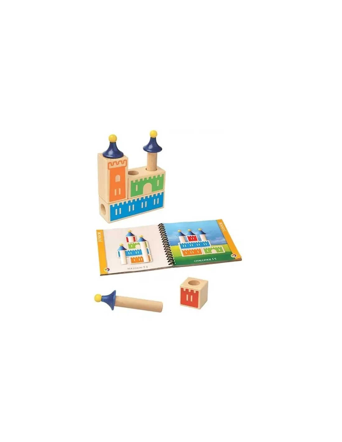 Muni de 4 blocs de bois, utilisables aussi bien à la verticale qu’à l’horizontal et de 3 tours de différentes tailles, le jeune architecte devra reproduire le modèle de château qui lui est donné. A lui de trouver le montage des pièces pour y arriver.