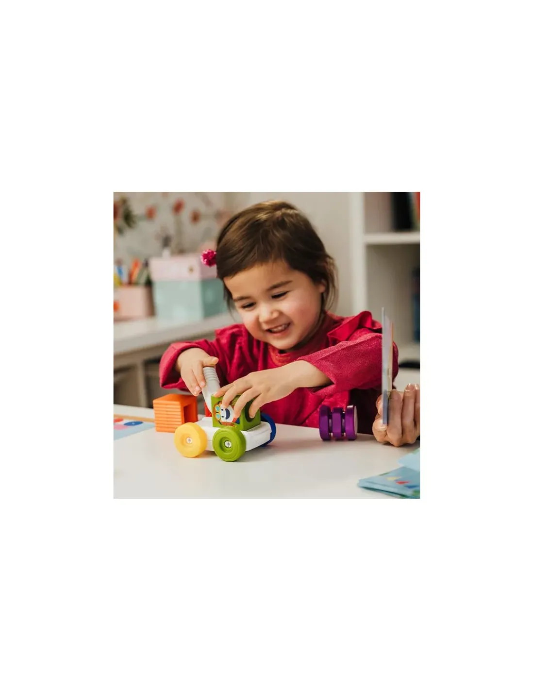 Grâce à ce jouet 2 en 1, votre enfant pourra laisser libre court à son imagination en plaçant les pièces sur le chassis recto-verso, afin de construire son propre véhicule magnétique. Il pourra également suivre les instructions pour réaliser 24 modèles indiqués sur les cartes défis.