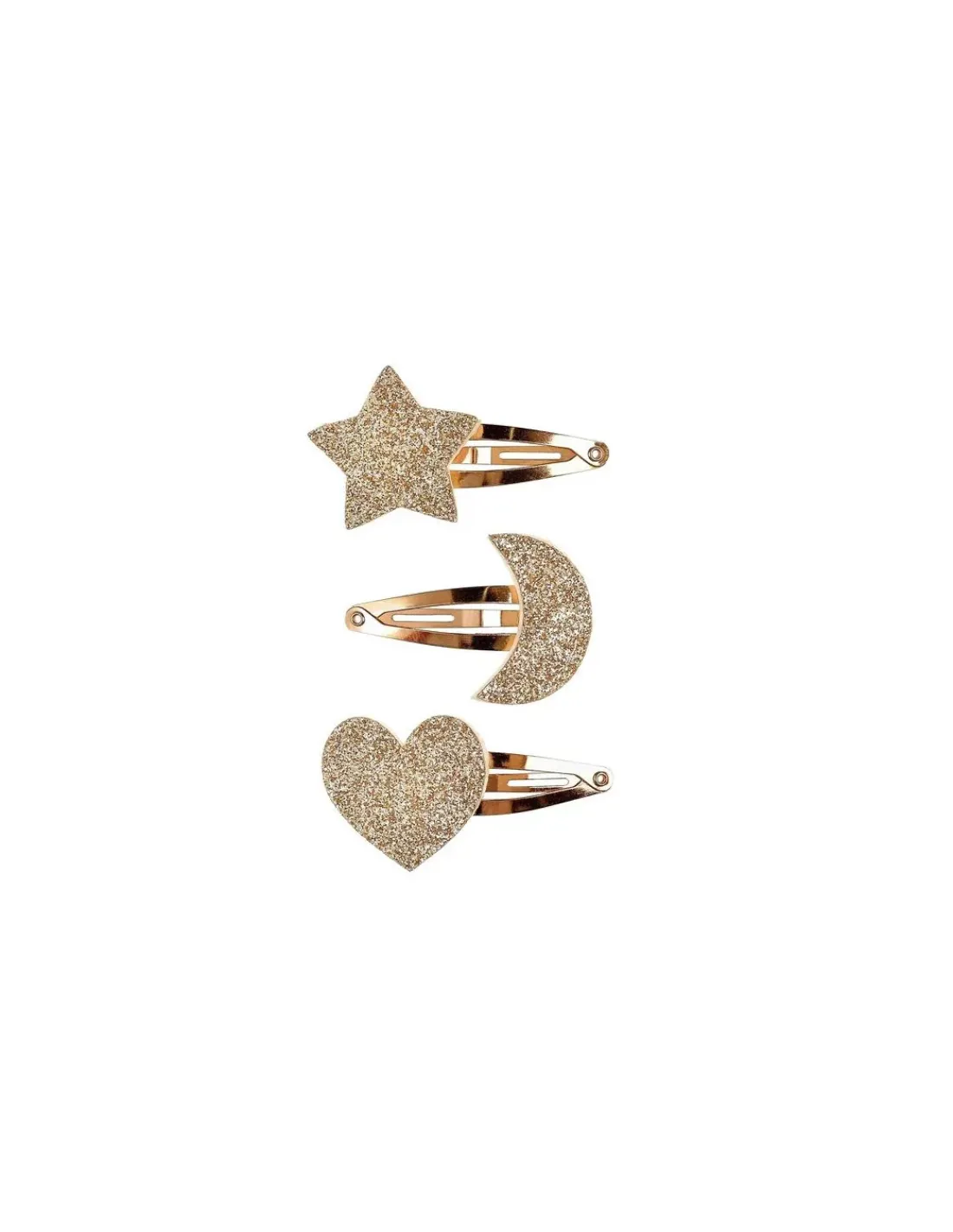 Découvrez les Barrettes Penelope étoile lune coeur de Souza, des accessoires de cheveux pour les enfants à partir de 3 ans. 3 adorables barrettes dorées pour la chevelure de votre enfant avec une étoile, une lune et un coeur avec des paillettes dorées.