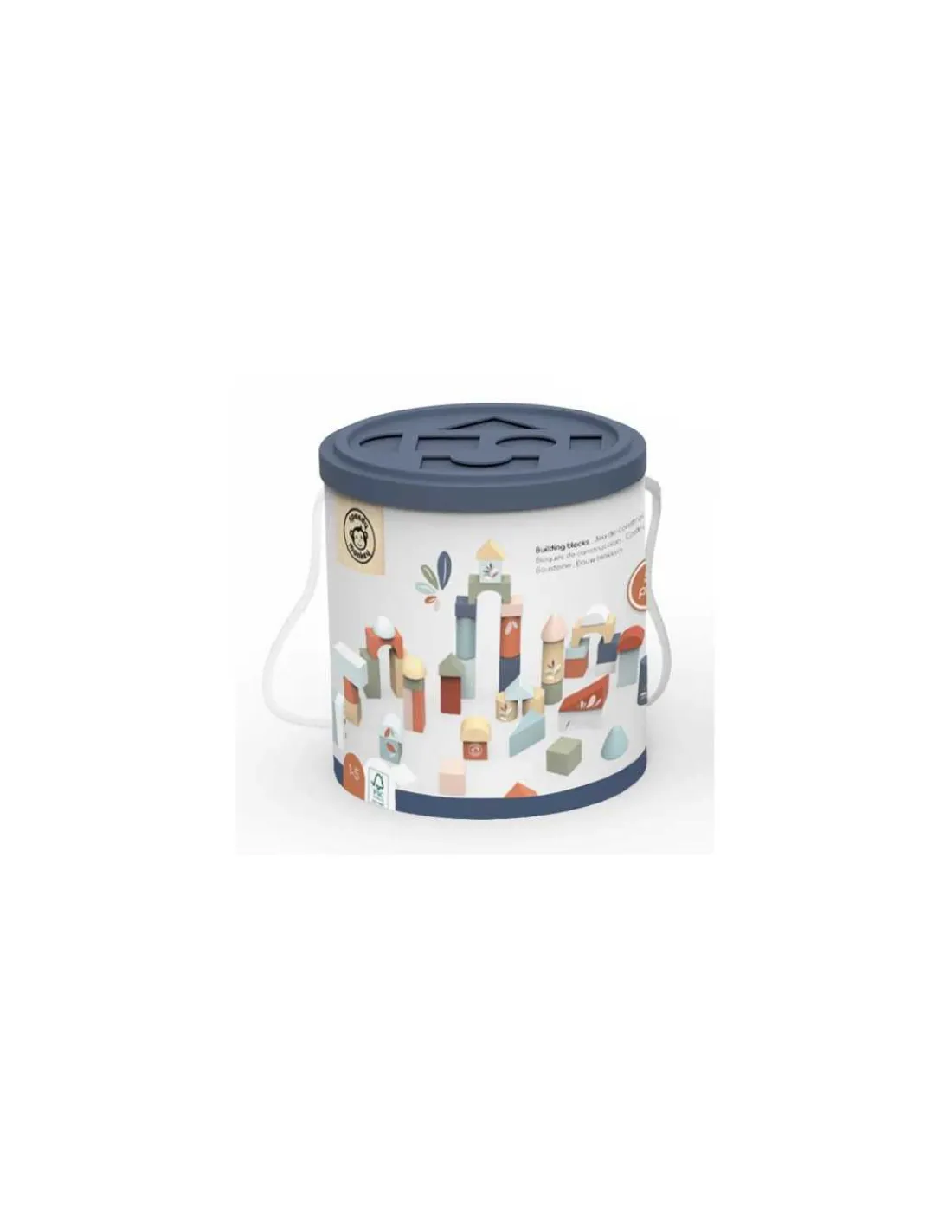 Les blocs sont présentés dans un joli seau rond avec une poignée et un couvercle trieur de formes, rendant leur rangement amusant.