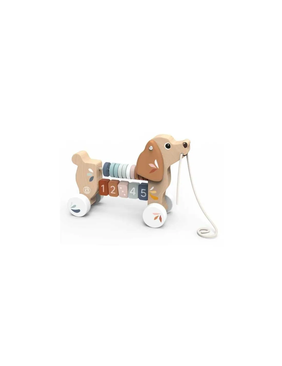 Tenant sa corde dans la bouche, cet adorable petit chien invite les enfants à le tirer derrière eux et attend avec impatience d’être promené partout dans la maison! Son corps renferme de jolies surprises : une tige en métal avec des perles aux couleurs douces à faire glisser, façon boulier, ainsi que des pièces en bois rotatives illustrées des chiffres de 1 à 5 d’un côté, et du nombre de points correspondant au verso. Un excellent moyen d’initier votre enfant aux premières notions de comptage.