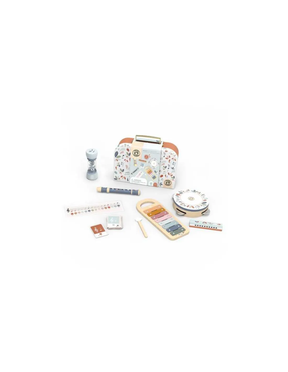 Cette valisette musicale inclut cinq instruments pour découvrir le plaisir de la musique : un xylophone coloré, un tambourin doux, un bâton de pluie, une flûte et un harmonica. Chaque instrument aide à développer la coordination, les compétences sensorielles et l’aptitude musicale des enfants.