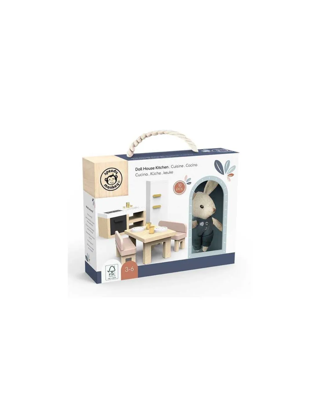 Découvrez la cuisine pour maison de poupée de Speedy Monkey, un coffret cadeau comprenant des meubles de cuisine en bois et un personnage lapin en lin qui fera rêver les enfants à partir de 3 ans.