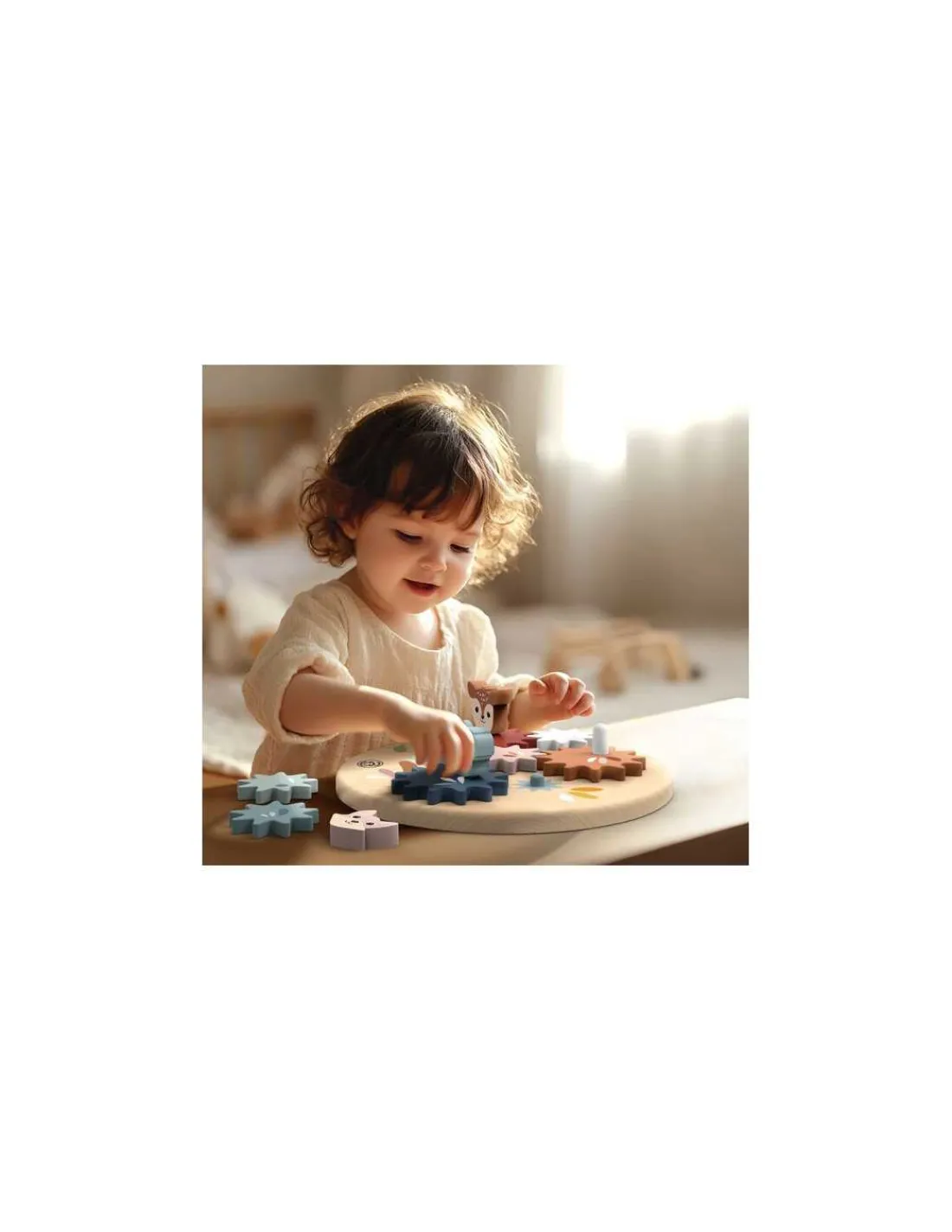 Votre enfant s’amusera à positionner les 7 roues crantées aux couleurs douces sur les petits piliers en bois. Puis, en actionnant la roue marron avec la poignée, il déclenchera une réaction en chaîne spectaculaire.