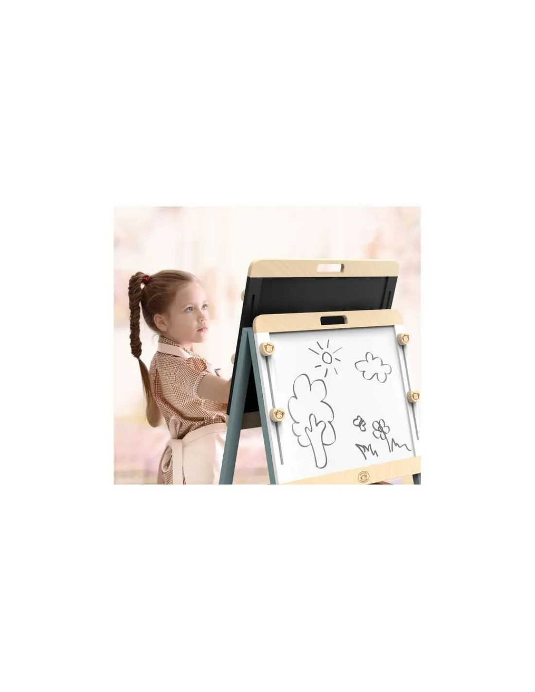 Ce chevalet ajustable en bois comprend un tableau noir et un tableau blanc magnétique pour des heures de créativité. Les écrous permettent d’ajuster la hauteur en fonction de la croissance de l’enfant.