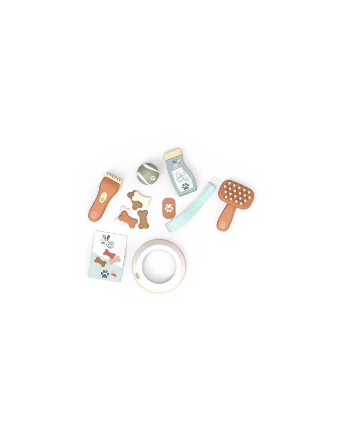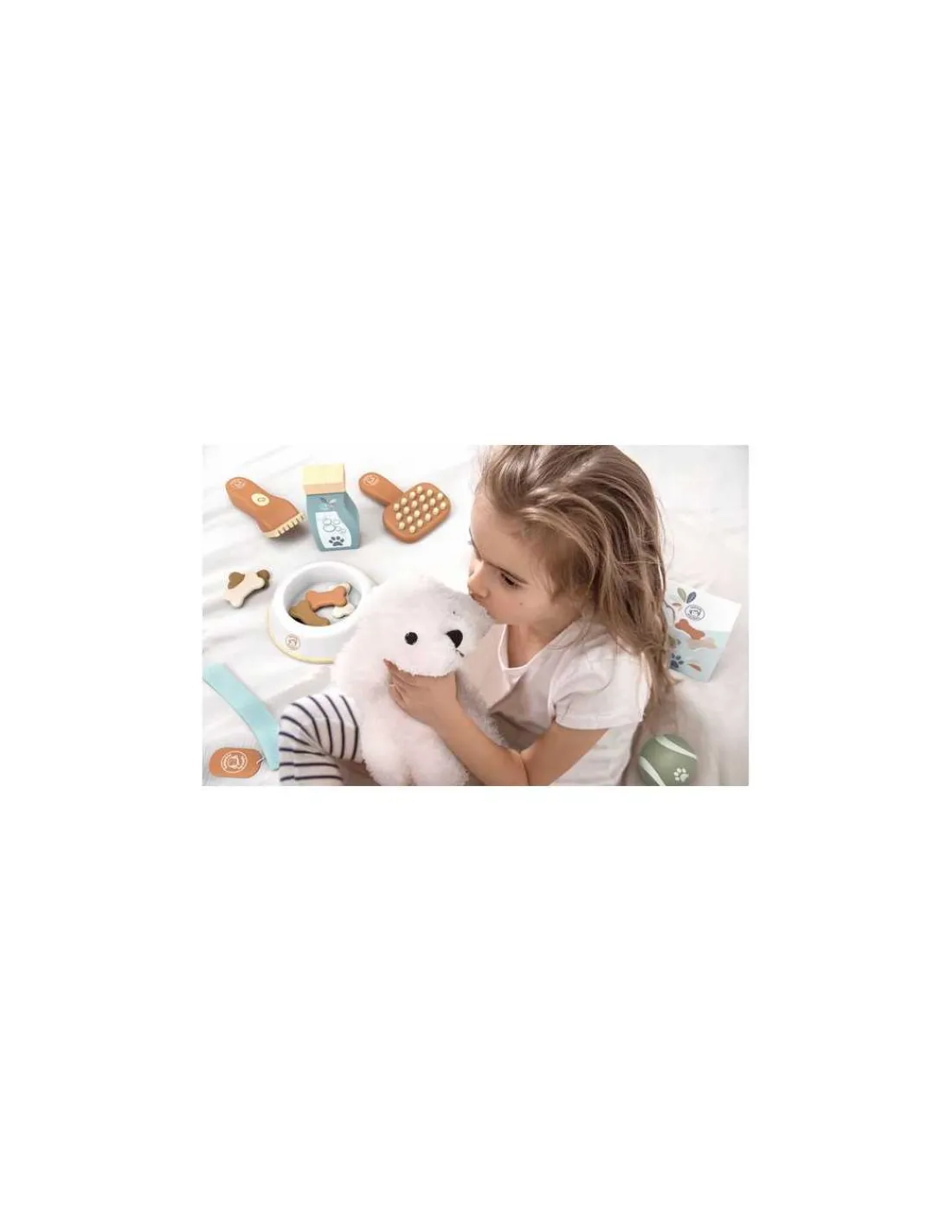 Cette valisette joliment conçue contient tout ce dont votre enfant a besoin pour prendre soin de son chien en peluche inclus. Elle comprend des accessoires comme des friandises, un bol, une brosse et un collier.