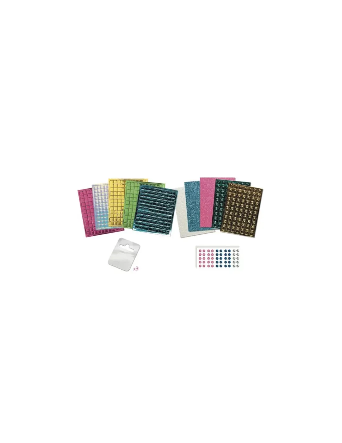 Ce coffret contient 3 tableaux de 22 x 22 cm, 950 mosaïques rondes et carrées, 50 strass, 3 supports d’accroche et un guide pas à pas dans une magnifique boite illustrée.