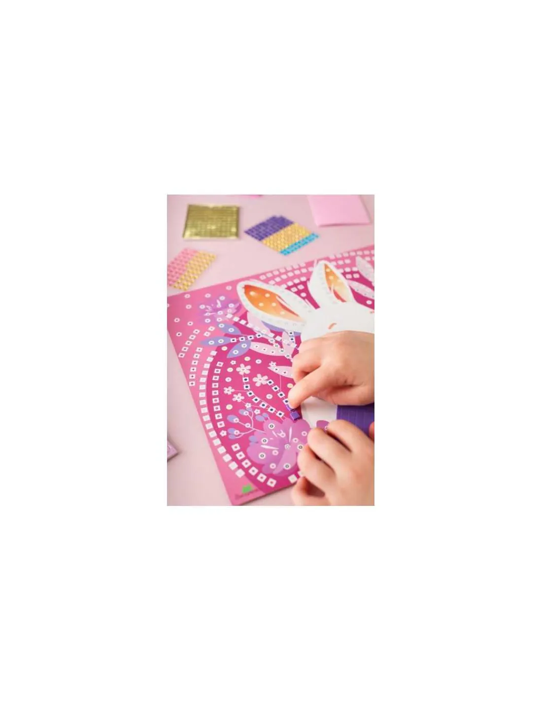 Ce coffret contient 5 tableaux de 24 x 34 cm, +2000 mousses autocollantes et joyaux, 5 supports d’accroche et un guide pas à pas dans une magnifique boite illustrée.
