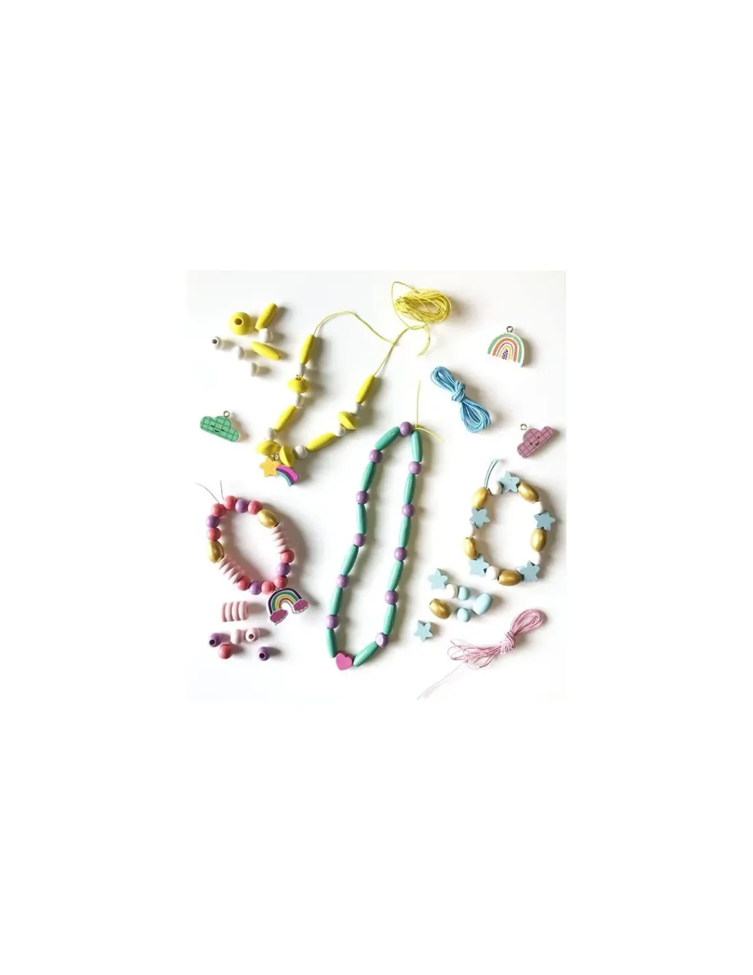 Un coffret original en forme d’arc en ciel contenant de jolies perles aux couleurs pastels pour créer de magnifiques bijoux: colliers, bracelets… Livré avec 3 mètres de fil, dans un joli coffret qui sert aussi de rangement.