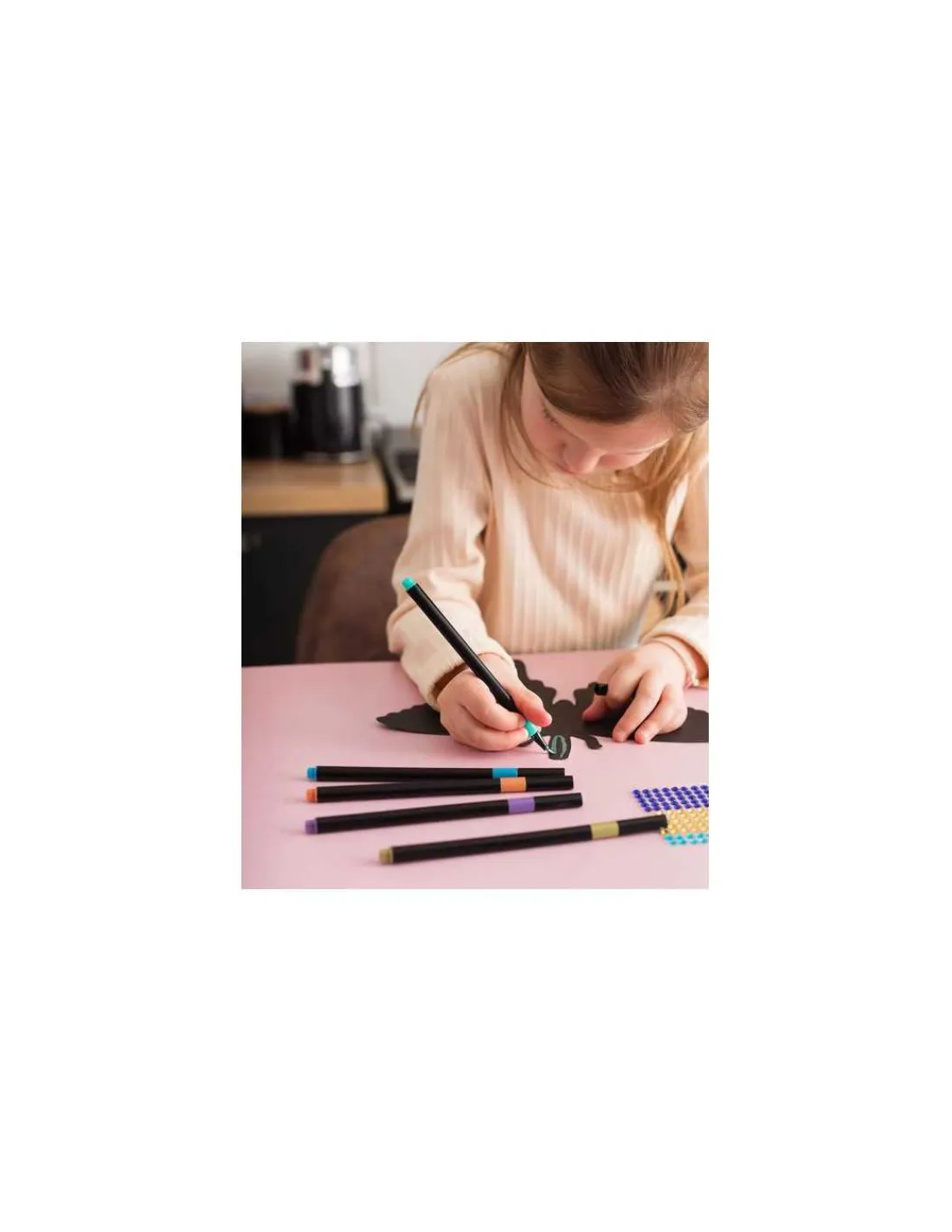 Ce coffret contient 6 papiers noirs gaufrés, 8 feutres métallisés, 100 gems et 1 livret avec modèles et instructions.