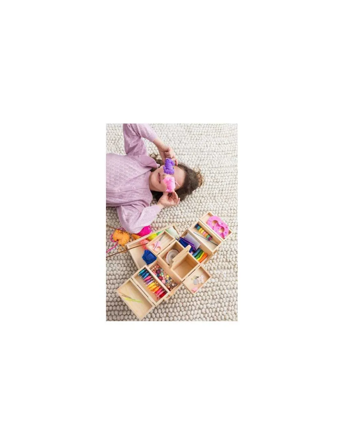 Découvre dans cette magnifique boîte en bois une multitude d’accessoires pour réaliser des activités autour du fil.