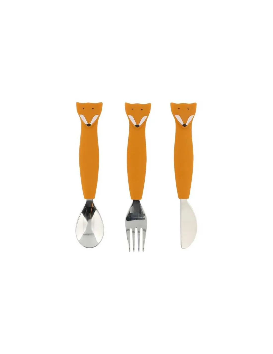 Découvrez les couverts en silicone Renard de Trixie, de la vaisselle pour enfant comprenant une fourchette, une cuillère et un couteau avec la jolie frimousse du renard Trixie.