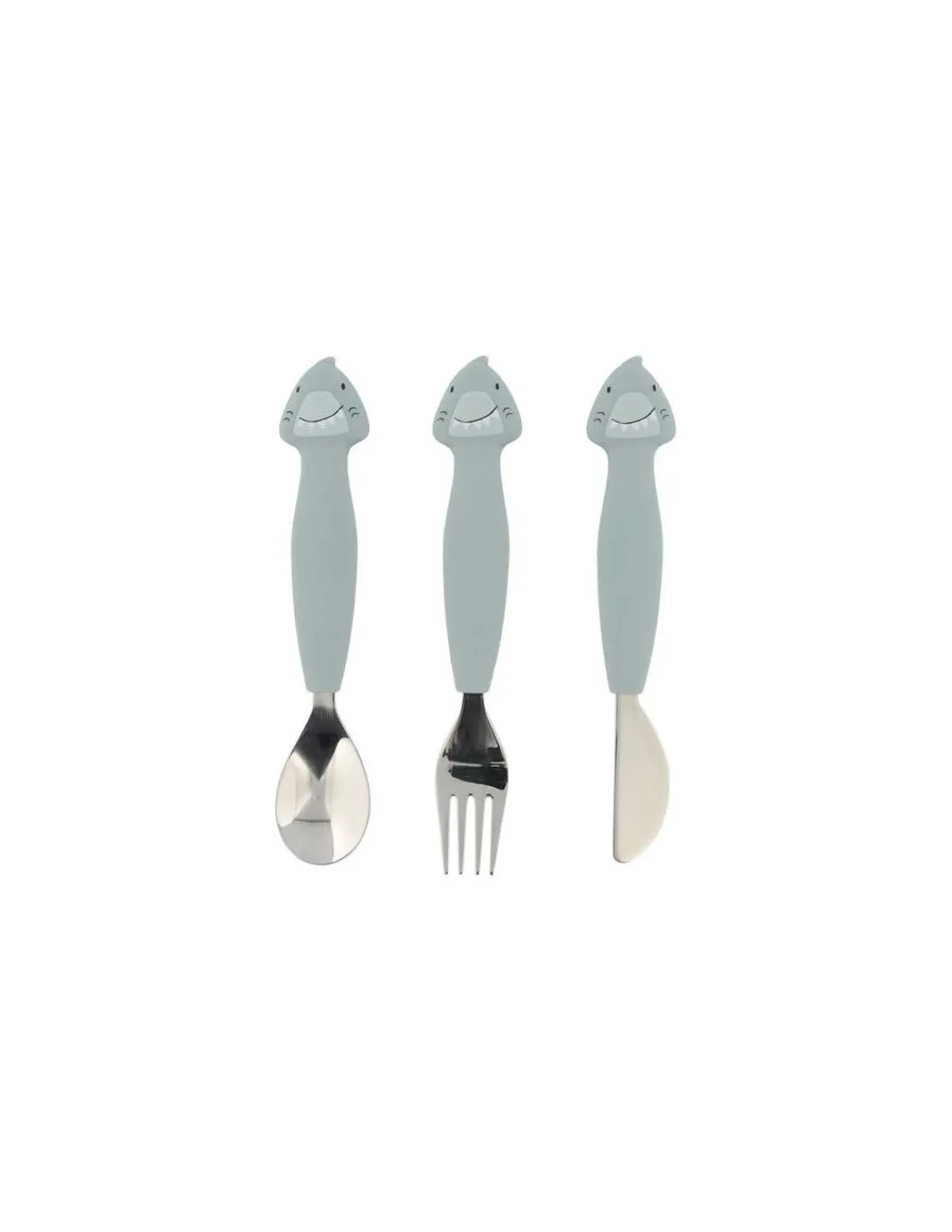 Découvrez les couverts en silicone requin de Trixie, de la vaisselle pour enfant comprenant une fourchette, une cuillère et un couteau avec la jolie frimousse du requin Trixie.