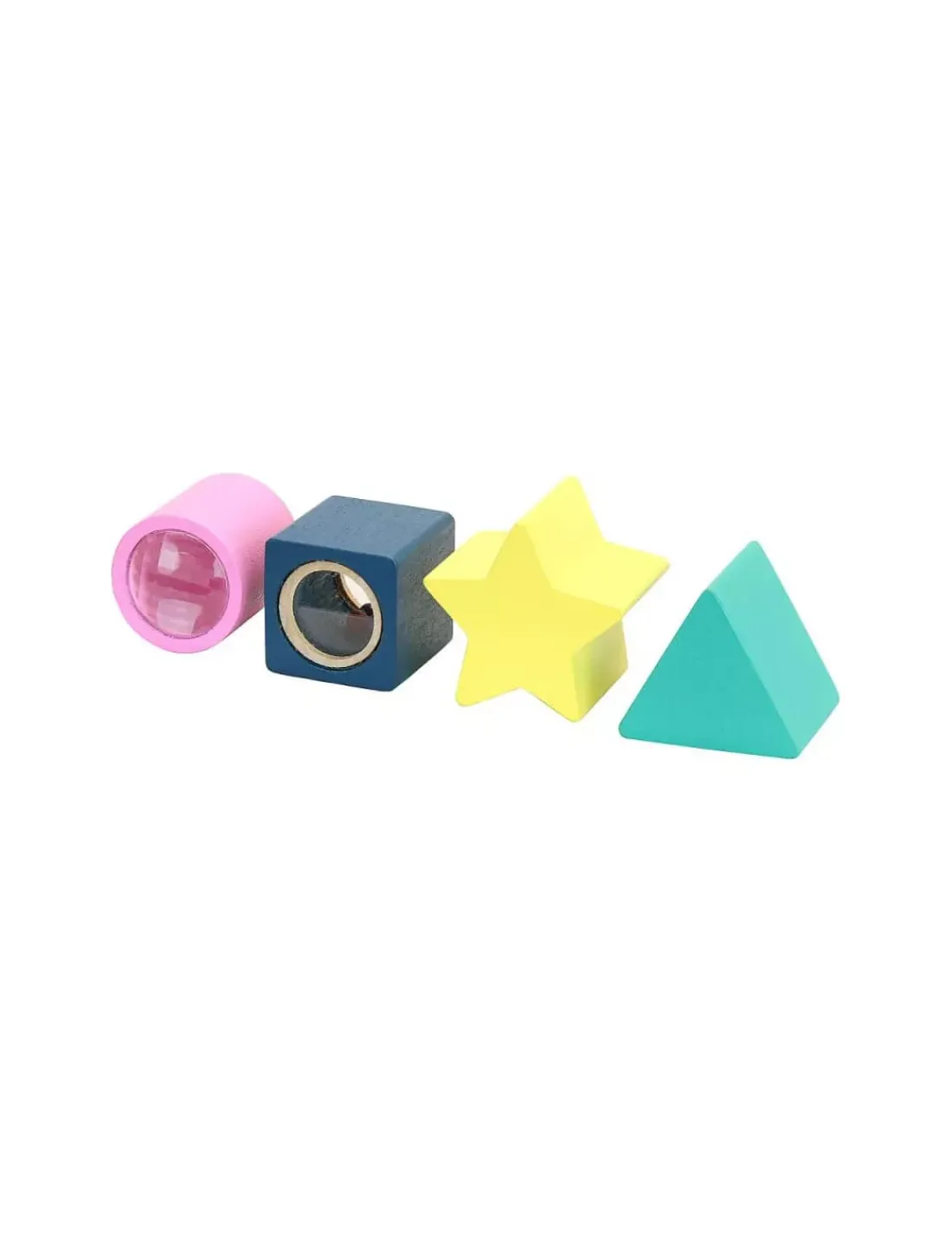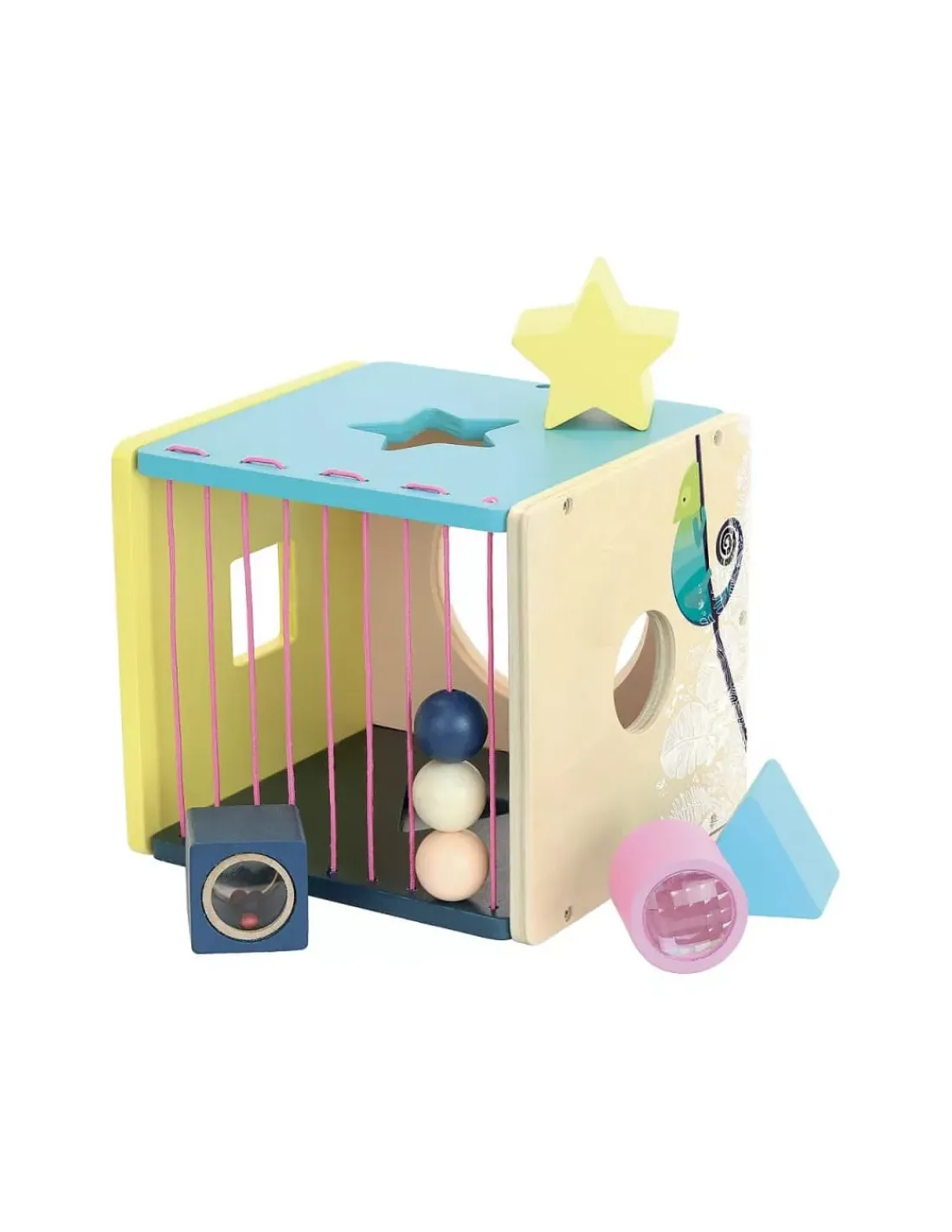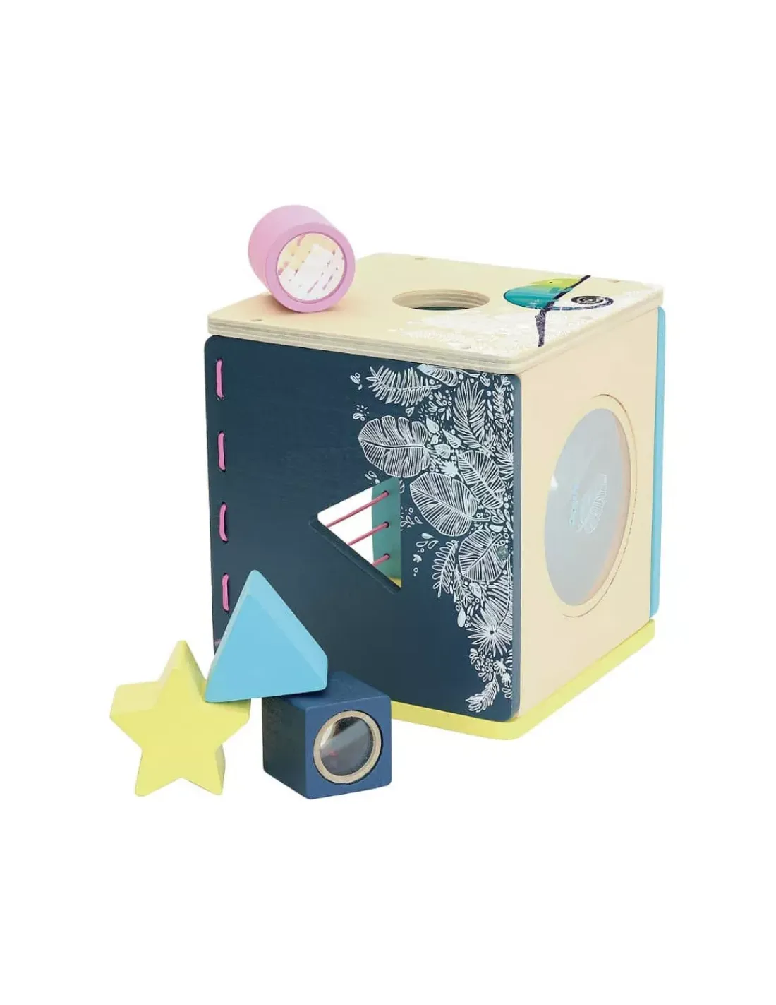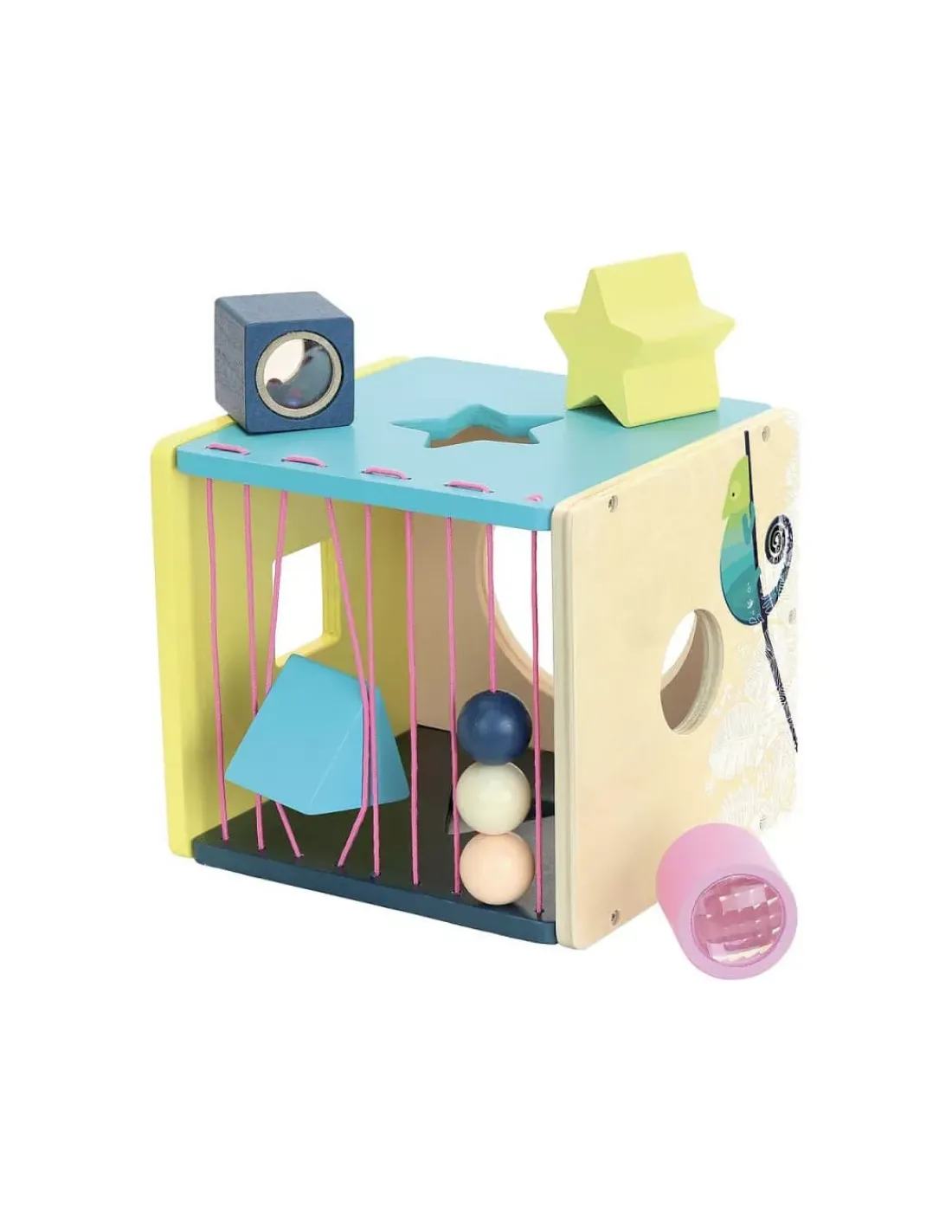 4 formes sensorielles à encastrer dans ce jolie cube : un cylindre kaleidoscope, un cube maracas, une étoile et triangle sonore. Votre enfant s’amusera à récupérer ses pièces en glisser sa main dans le rideau d’élastique ou en passant sa main dans la grande ouverture.