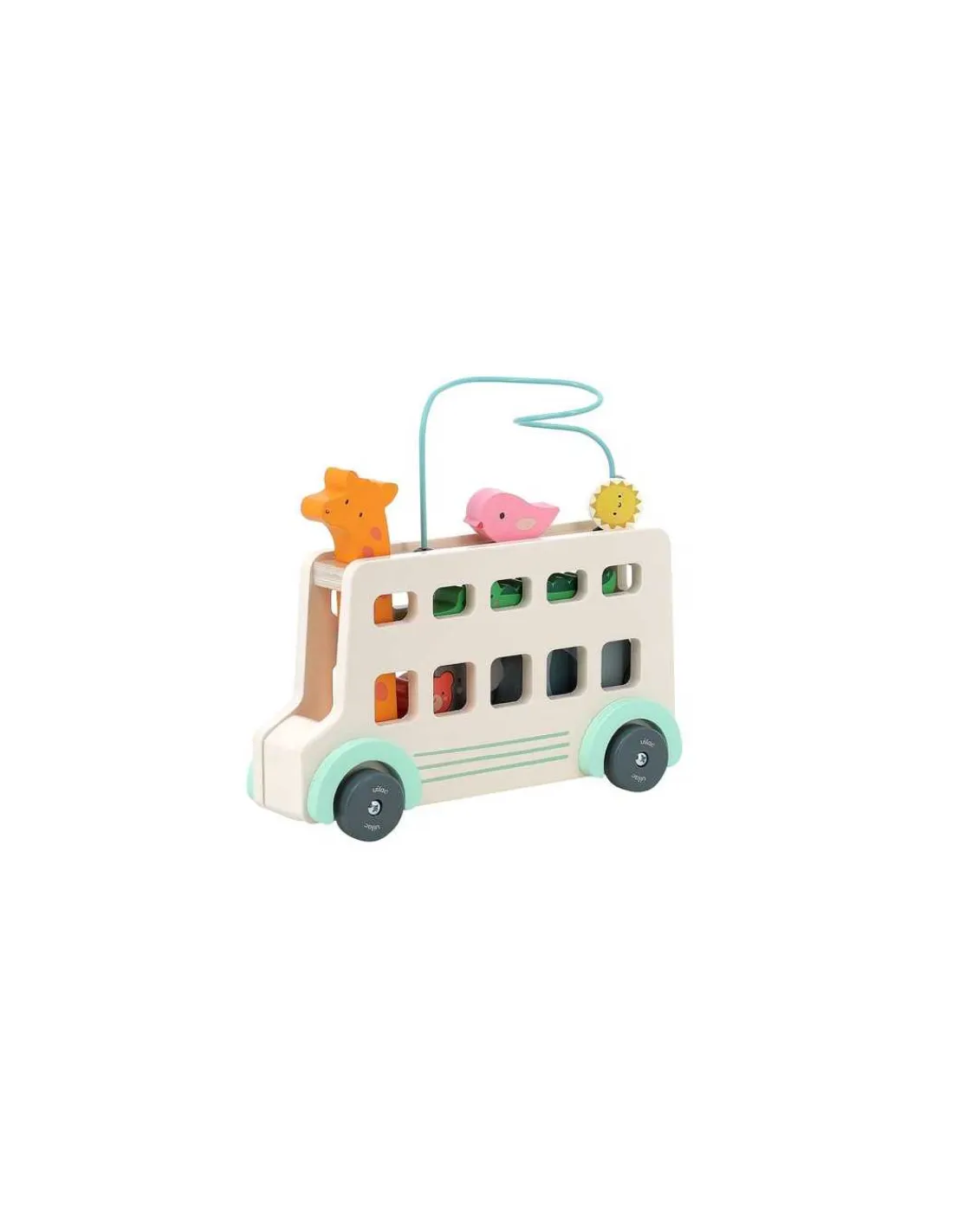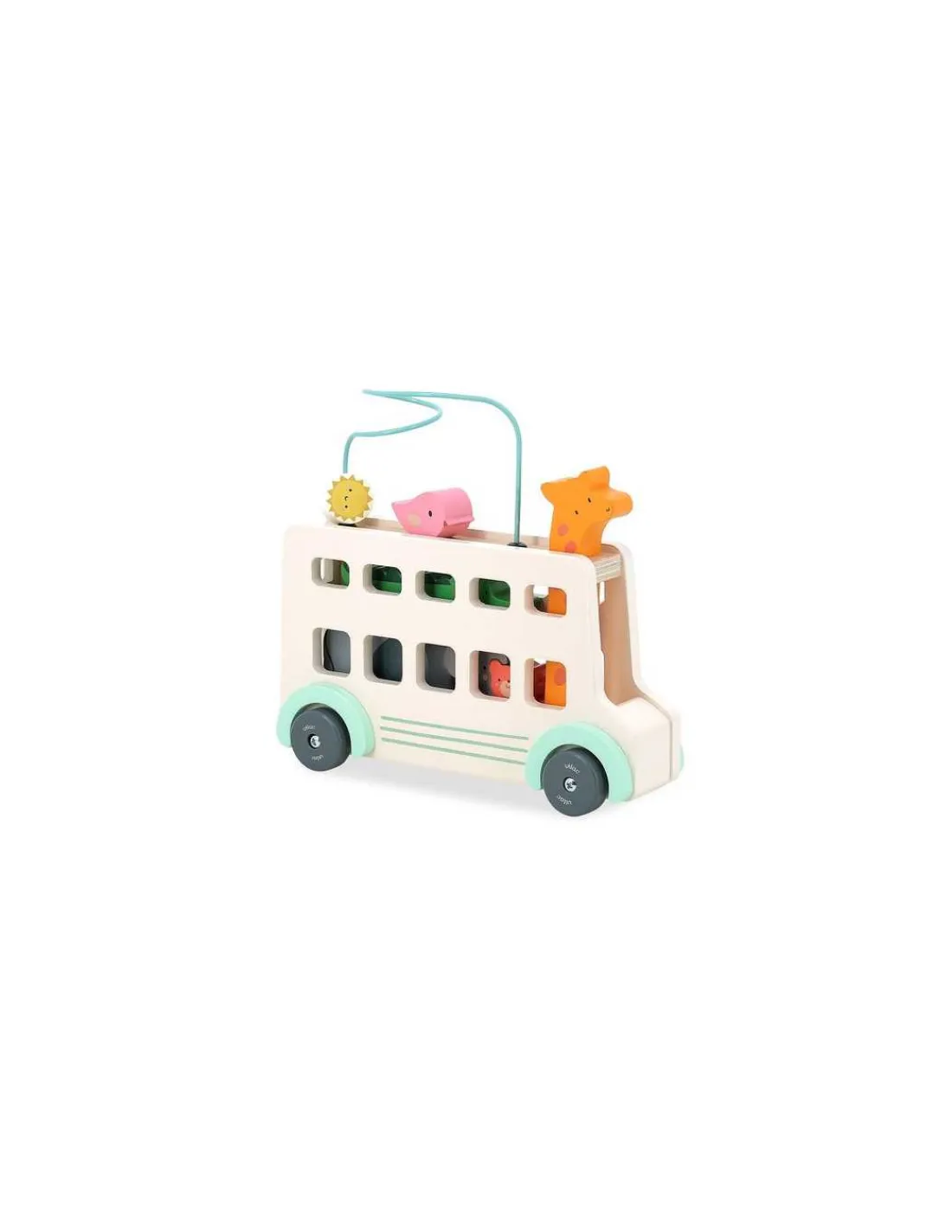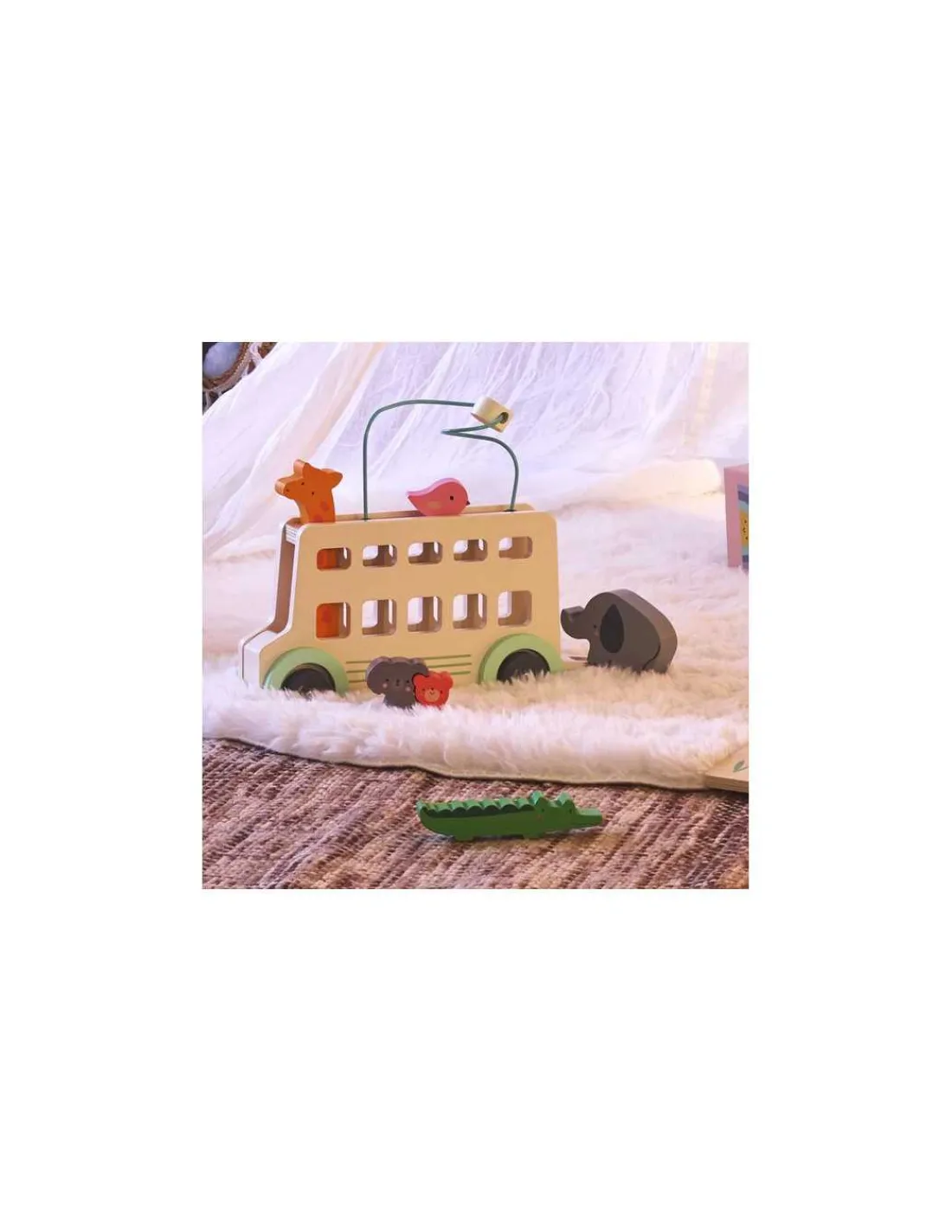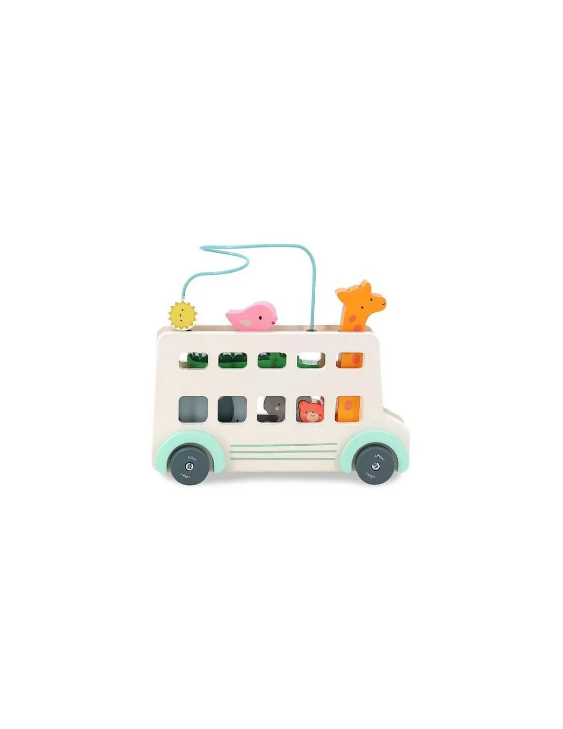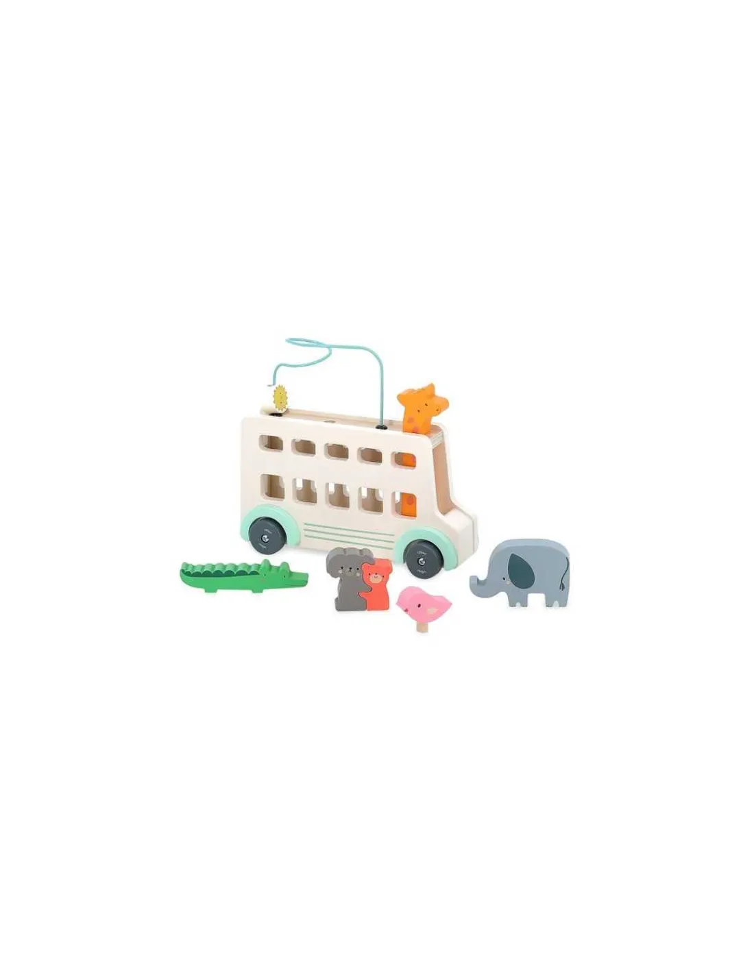 Le jouet comprend un autobus en bois, une girafe klaxon, un soleil le long d’un fil, un oiseau, un éléphant, un koala et un ours.