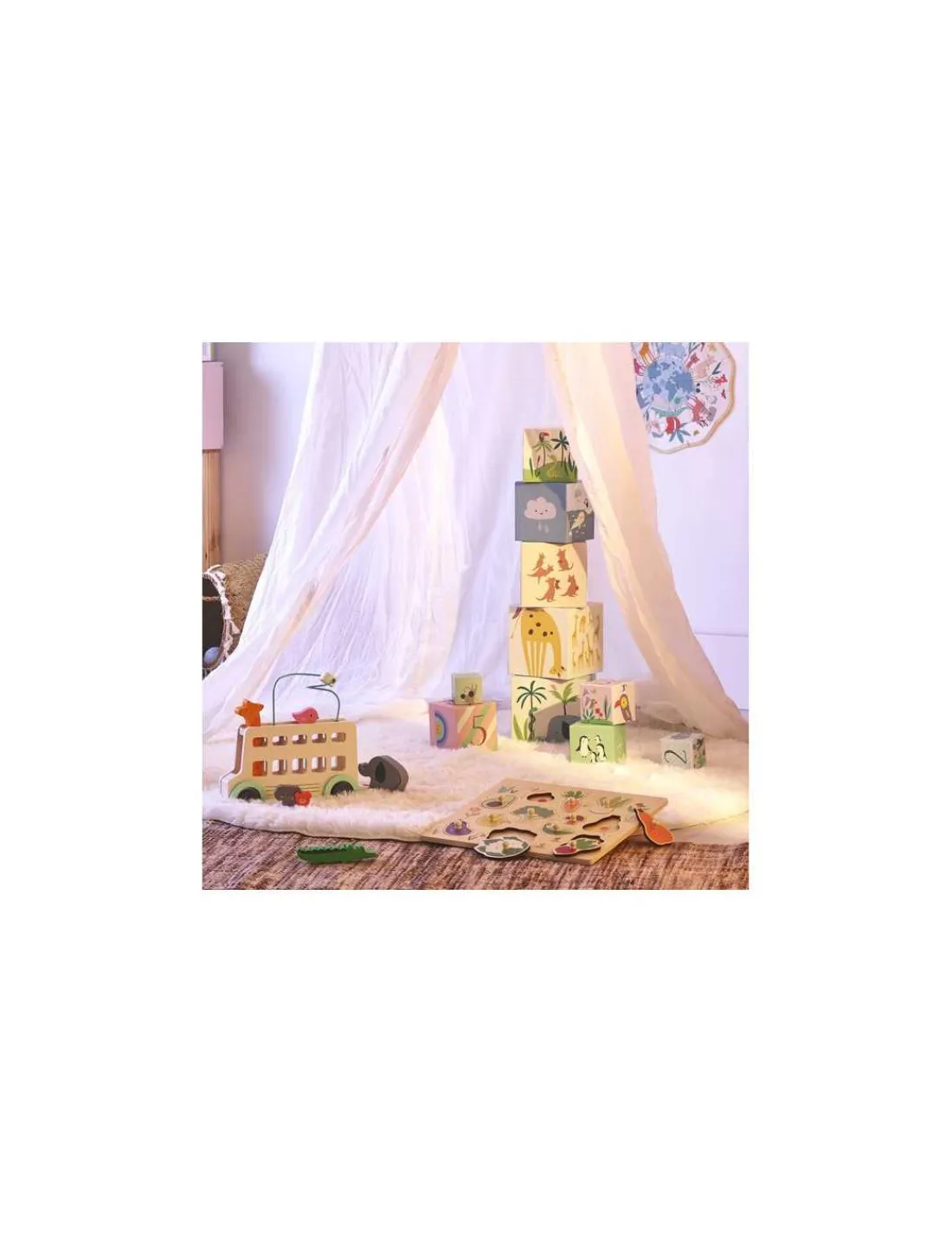 Ce bus d’éveil en bois trouvera aussi sa place comme douce et poétique décoration dans la chambre de votre enfant.