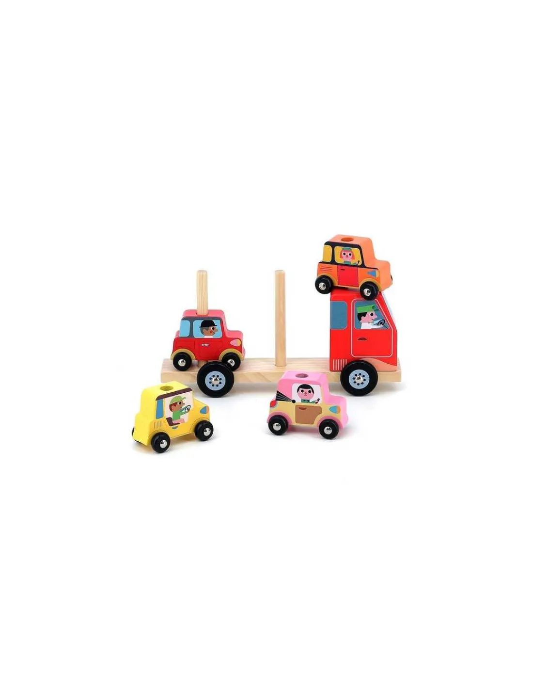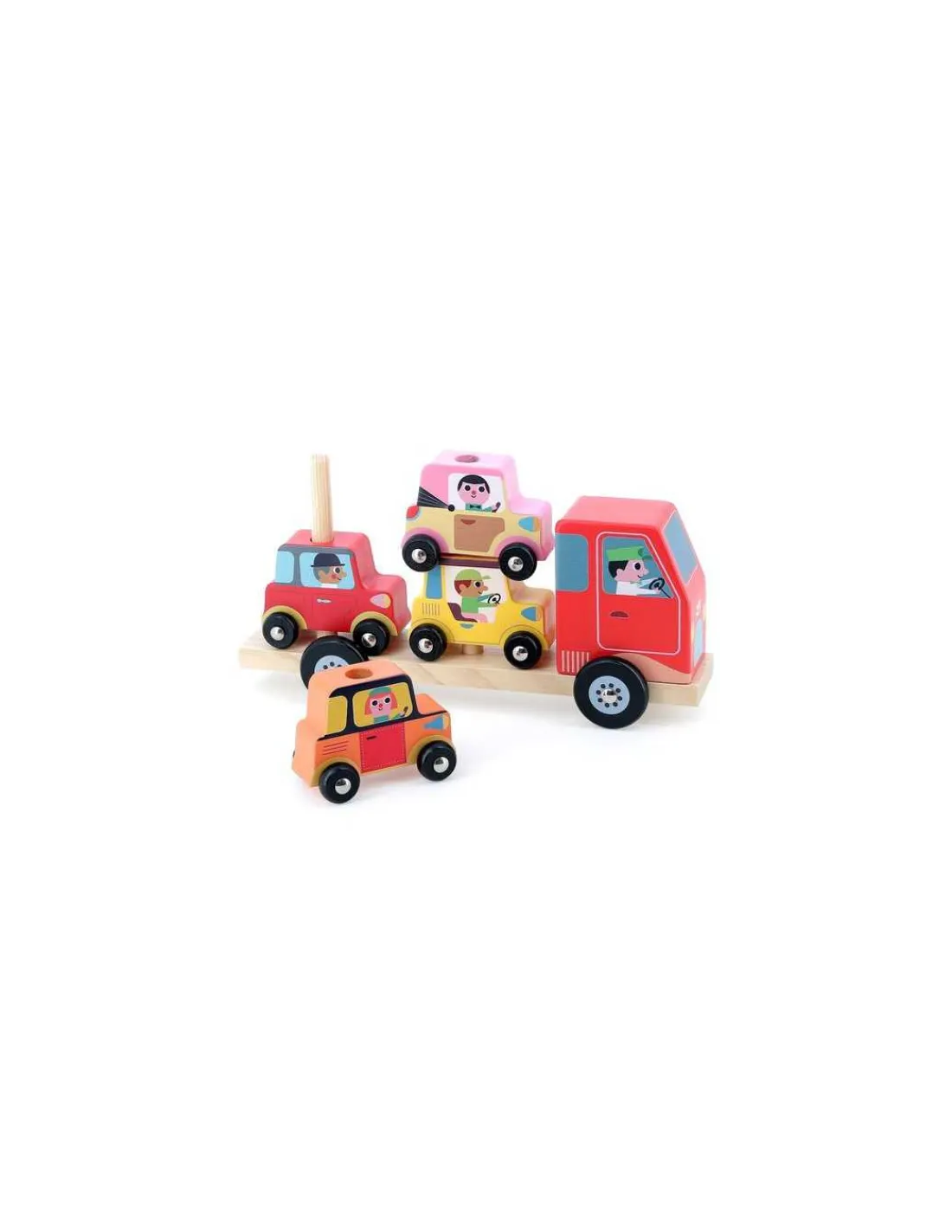 Découvrez le jeu Empil’auto 4 pièces de Vilac, un jouet d’éveil en bois pour les enfants dès 2 ans, un jeu d’empilement avec un camion et des voitures illustré par Ingela P.Arrhenius.