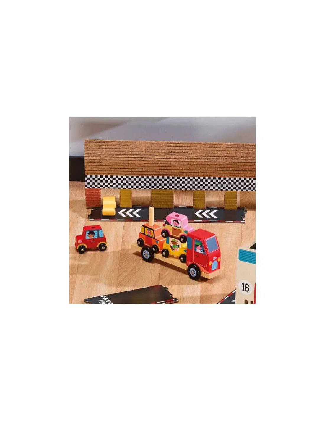 Un beau jouet en bois pour la dextérité et l’éveil de votre enfant, un très joli cadeau pour les filles et les garçons dès 2 ans qui comprend 1 camion en bois et 4 véhicules en bois.