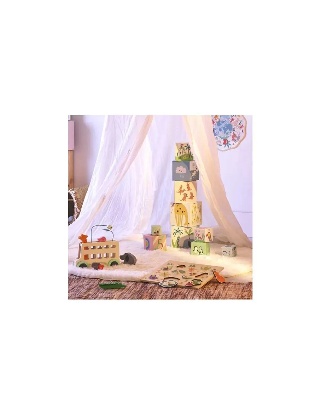 Doté de chevilles en bois adaptées aux petites mains des enfants, cet encastrement de 12 pièces décoré avec beaucoup de poésie par Sarah Betz est un formidable support pour le développement de la motricité fine des petits.