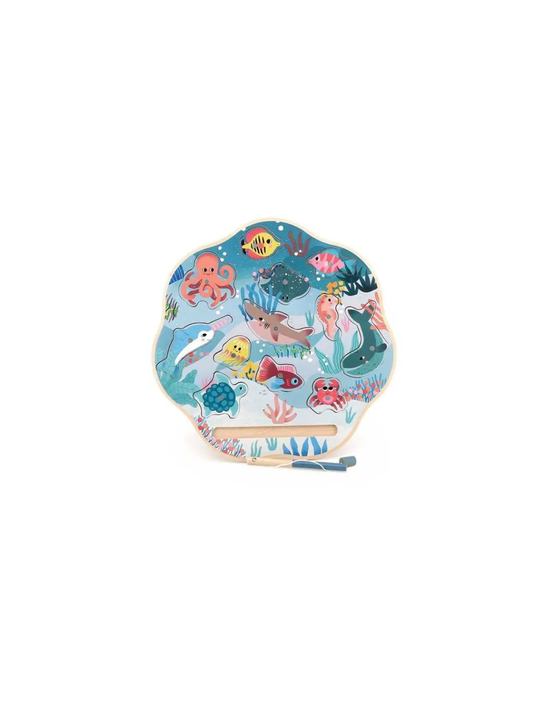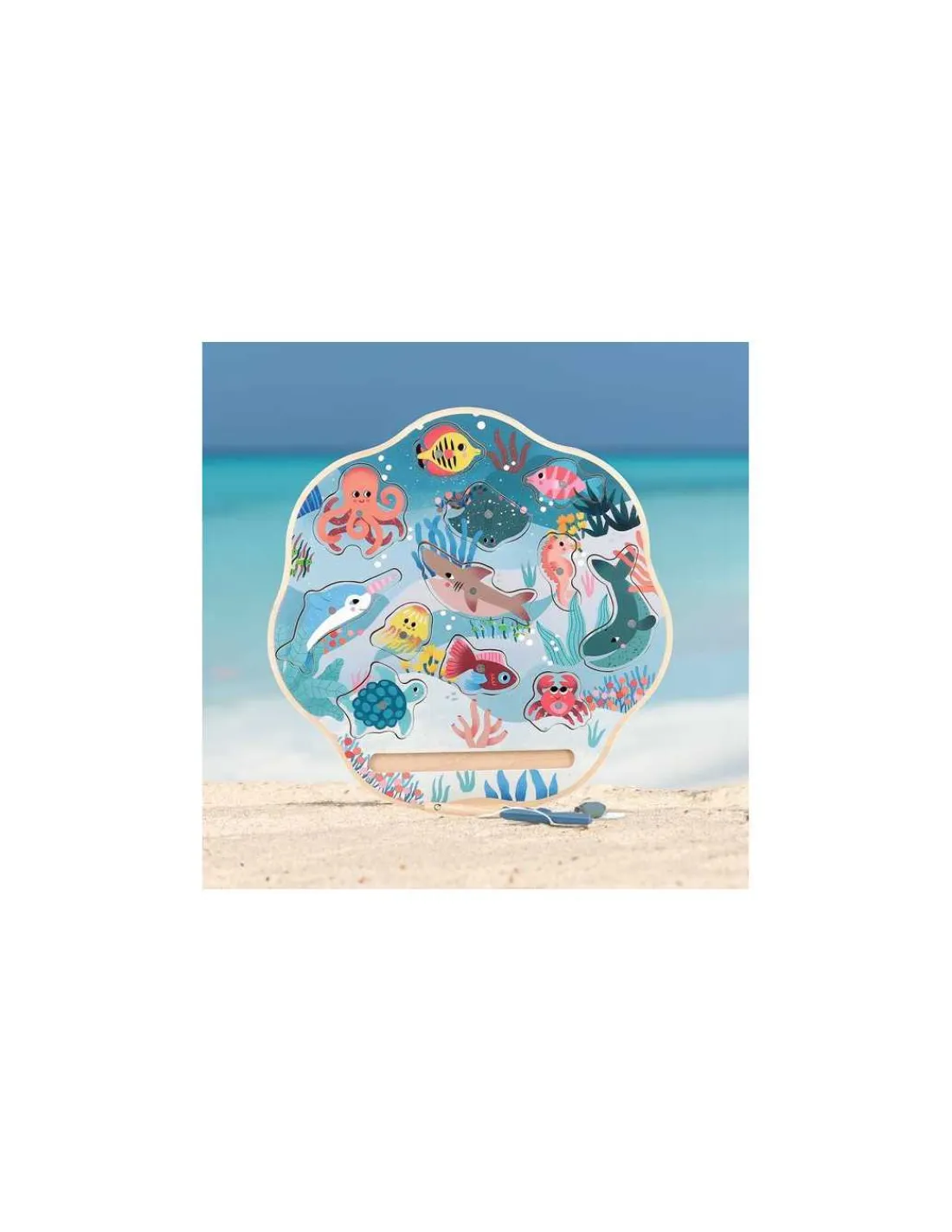 Votre enfant, muni de sa canne à pêche en bois magnétique, va devoir relever un sacré défi : attraper tous les animaux marins ! Au cours de sa plongée, il rencontrera une raie, une baleine, un crabe, une méduse…