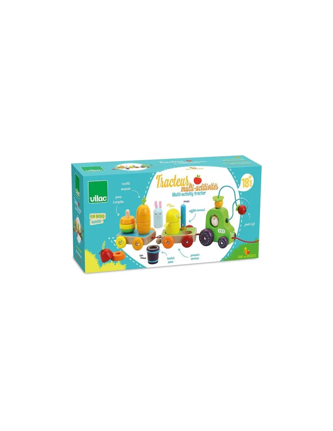 Découvrez le tracteur multi activités jour de récolte de Vilac, un jouet d’éveil en bois pour les enfants dès 18 mois, un jouet à tirer avec plein d’activités pour éveiller les bébés.