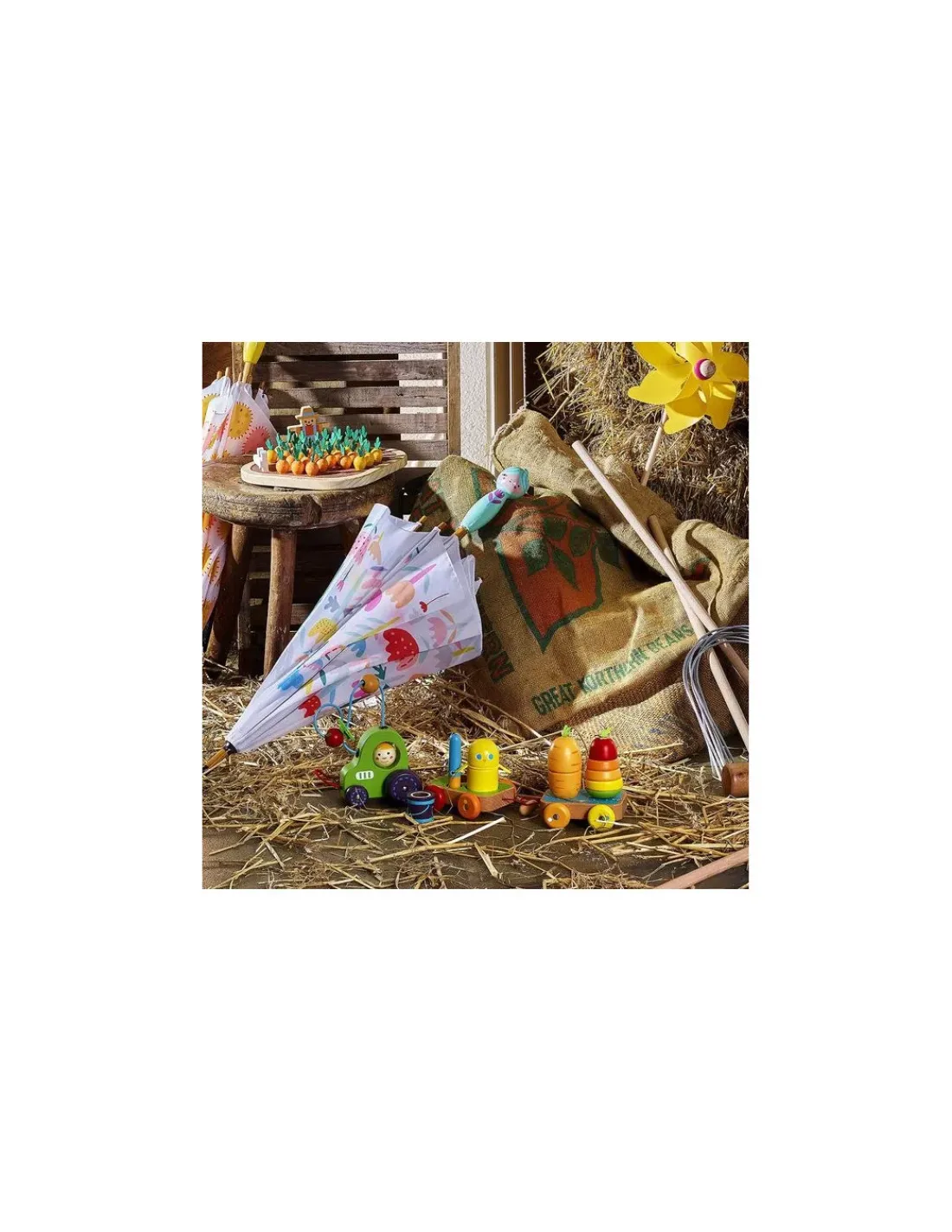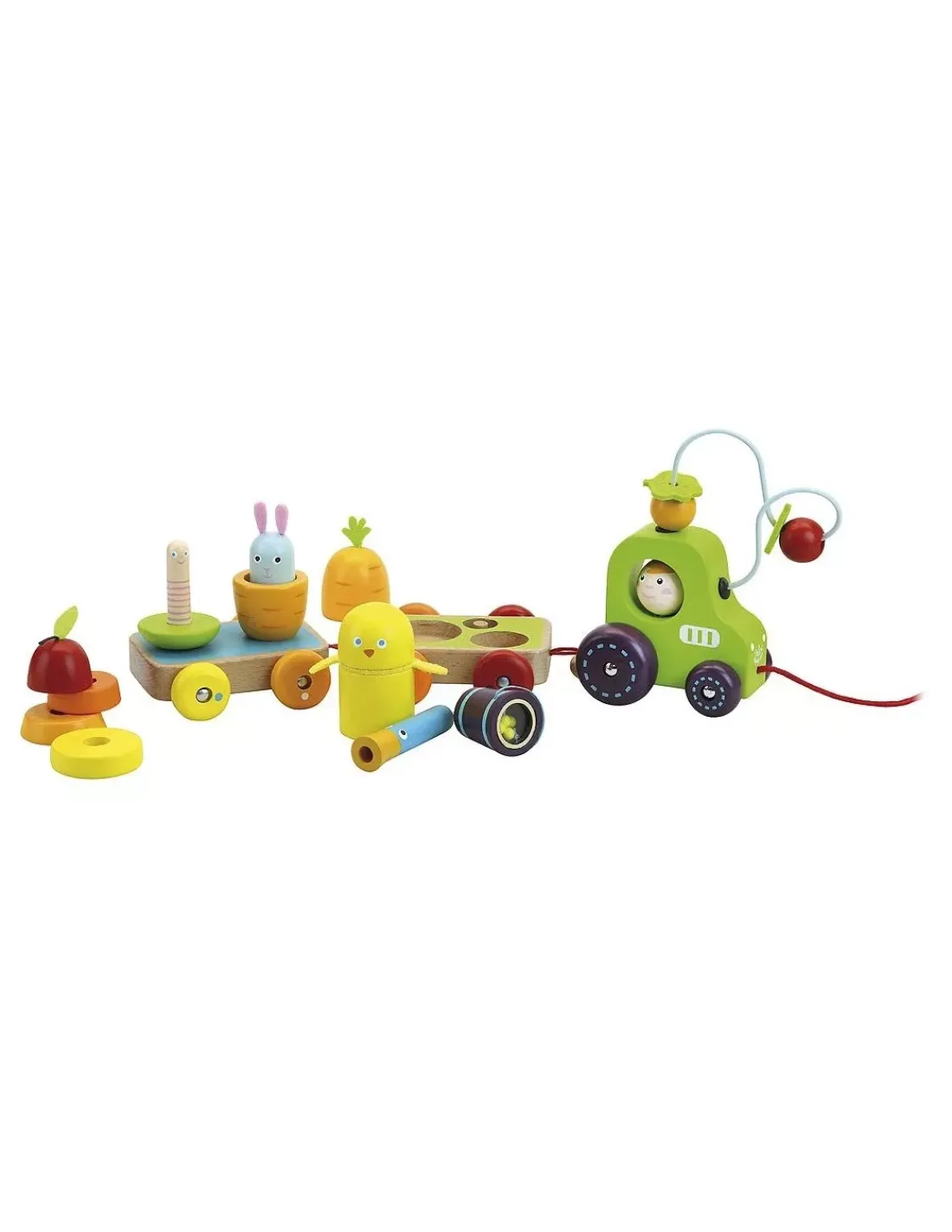 Un empilable poire qui cache un ver, un petit lapin caché dans une carotte, un oiseau et un canard qui font du bruit, un seau de maïs maracas et un tracteur avec un conducteur Monsieur / Madame sur lequel il faut faire coulisser des fruits sur un boulier.