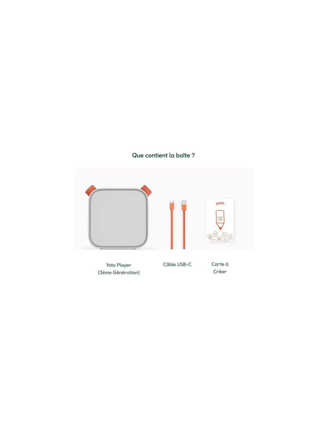 Le coffret comprend le lecteur Yoto player, un cable USB et une carte à créer.